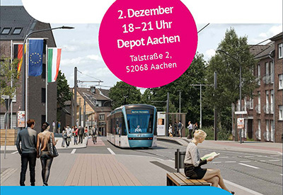 Die Öffentlichkeit wird in die Planungen der Regiotram miteinbezogen. Im Sommer 2025 begann die Vorplanung, so dass nun ein weiterer Meilenstein erreicht ist, an dem die Öffentlichkeit teilhaben soll. Beim Infomarkt am 2. Dezember 2025 von 18-21 Uhr im Depot an der Talstraße 2 in 52068 Aachen sind Interessierte herzlich eingeladen, sich über die neusten Entwicklungen zu informieren und ihre Gedanken zum Projekt Regiotram mit Projektbeteiligten sowie Expertinnen und Experten vor Ort zu diskutieren.