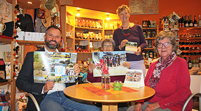 Impressionen aus Sambia für den guten Zweck: Bürgermeister Tim Krämer (links) hat sich von der Vereinsvorsitzenden Gertrud Kutscher (hinten) und den Helferinnen des Weltladen-Teams, Inge Kühne (Mitte) und Irmgard Dreesen den Sambia-Kalender 2026 vorstellen lassen