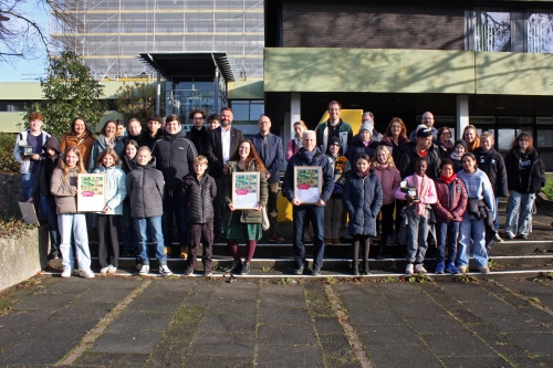 Jeweils ein Futterhaus für Eichhörnchen gab es als Anerkennung für die Teilnehmenden mit ihrem Beitrag zum Klimaschutz auf dem vierten bis sechsten Platz. Diese Plätze teilten sich die Grundschule Begau („Walking-Bus“ statt „Eltern-Taxi“), die Gustav-Heinemann-Gesamtschule („Streuobstwiese der Erinnerung“) und die Marienschule („Grünes Klassenzimmer“).