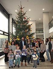 Mit vereinten Kräften geschmückt: Bürgermeister Tim Krämer (hinten, 3.v.l.) und Kinder aus den städtischen Familienzentren Annapark und Florianstraße haben die Wunschsterne in den Baum gehängt. Als Dankeschön gab es Adventskalender für die Kinder.