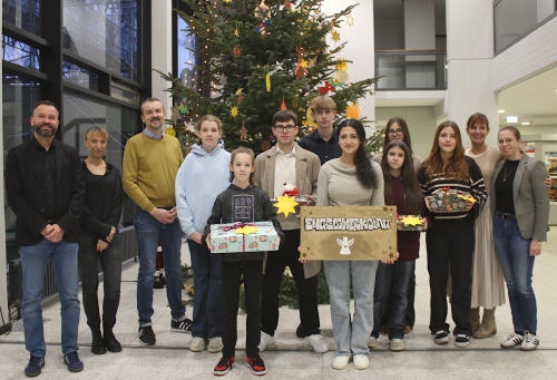 Das ging wieder schnell: 165 gelbe „Wunschsterne“ hingen in den Ästen des Weihnachtsbaumes im Foyer des Alsdorfer Rathauses – und binnen weniger Tage waren alle abgenommen. Von Menschen, die Kindern, deren Familien vielleicht das Geld für Präsente fehlt, zum Weihnachtsfest ein schönes Geschenk machen möchten. Auch Schülerinnen und Schüler der Marienrealschule haben einige festlich verpackte Geschenke abgegeben. Finanziert aus einem Teil des Erlöses ihrer „Engelswerkstatt“. Für die hatten Acht- und Neuntklässer unter anderem kunstvolle Engel aus Paletten und Dosen gefertigt und bei einem Basar verkauft. „Das ist ein tolles Engagement, das einfach nur Hochachtung verdient“, lobte Bürgermeister Tim Krämer bei der Übergabe der Pakete den Einsatz der Schülerinnen und Schüler. Und dieses Lob gebührt auch den übrigen Menschen, die bei der Wunschbaumaktion zu Wunscherfüllern geworden sind.